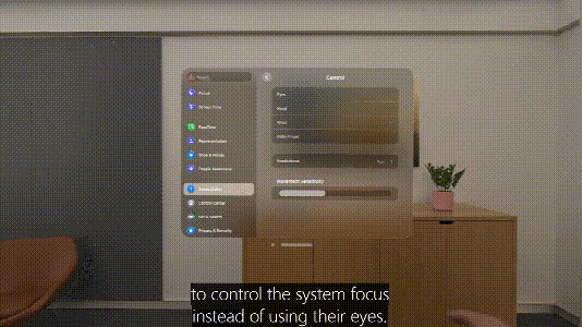 苹果还提供了输入指针控制辅助功能,允许人们使用不同的输入源来控制系统焦点,而不是只能使用眼球追踪功能来追踪眼睛注视的地方。使用眼睛作为焦点是Vision Pro默认设置,但在用户可以将系统焦点更改为由头部位置、手腕位置甚至是食指驱动,以最大限度适用不同的人群。