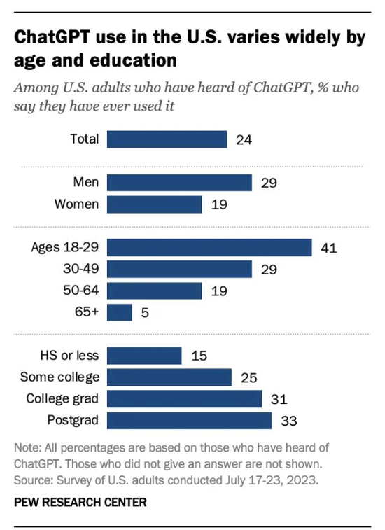 作为有大量“用户”作业输出的学校就是主要场景之一。据此前美国皮尤研究中心的一项调查,ChatGPT在美国地区的使用和担忧没有外界像想象的那么广泛。只有18%的美国人使用过ChatGPT,值得注意的是,最常使用它的群体是18-29岁受过大学教育的男性,虽然使用率在30-40%左右,但这仍然是一个重要场景。