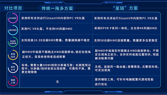 “星链”解决方案是一项将VR软件与硬件相结合的成套解决方案。“星链”通过无线局域网将演示者的PC VR内容高清同屏到多台一体机中,使一体机佩戴者获得清晰的沉浸式第一视角体验。据介绍,与一个月前发布时相比,目前“星链”解决方案中可同屏显示的一体机数量,已经突破了之前的30台上限,达到了50台,并在未来可实现“多拖多”方案,也就是可以做到多位演示者的PC VR内容高清同屏到多台一体机中。